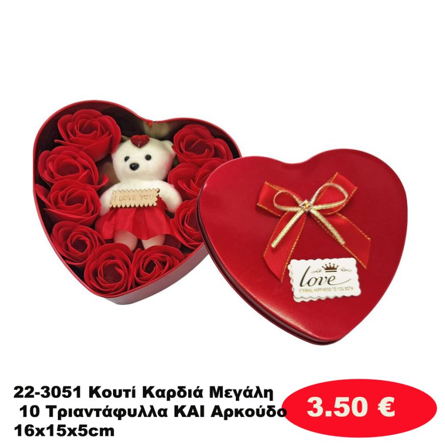 22-3051 Κουτί Καρδιά Μεγάλη 10 Τριαντάφυλλα ΚΑΙ Αρκούδο 16x15x5cm