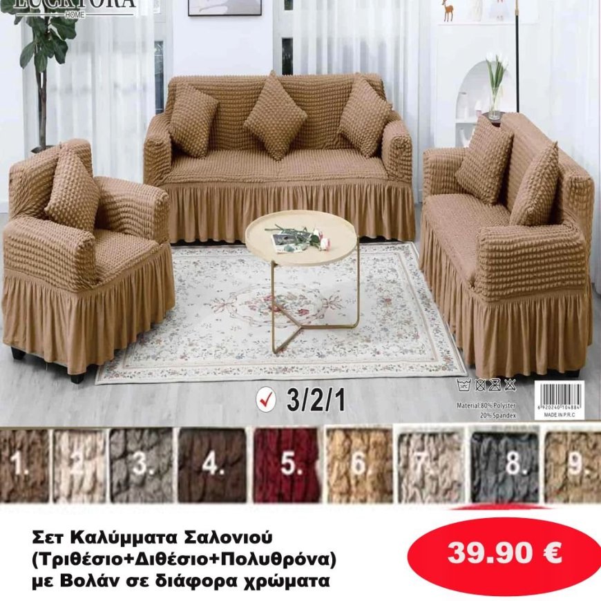 ΣΕΤ 3 Ελαστικά Καλύμματα Σαλονιού με Βολάν -Διθέσιο-Τριθέσιο-Πολυθρόνα σε διάφορα χρώματα