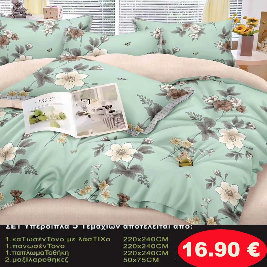 Σετ κρεβατοκάμαρας υπέρδιπλα 5 τμχ. 1-παπλωματοθήκη 220Χ240-1 κατωσέντονο με λάστιχο 220Χ240-1 πανωσέντονο 220Χ240 και 2 μαξιλαροθήκες 50Χ75 σε διάφορα χρώματα