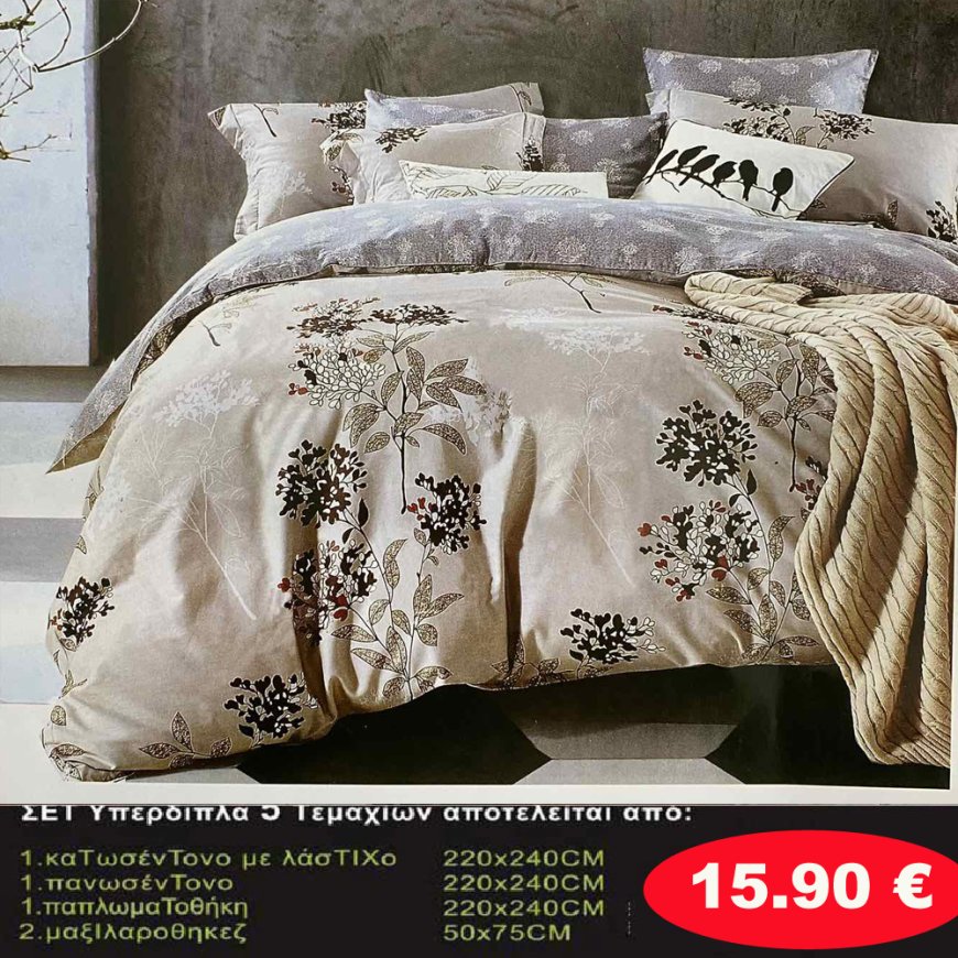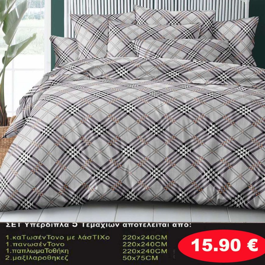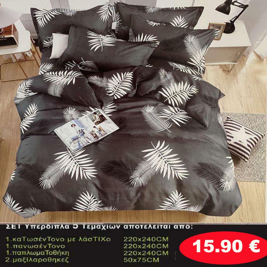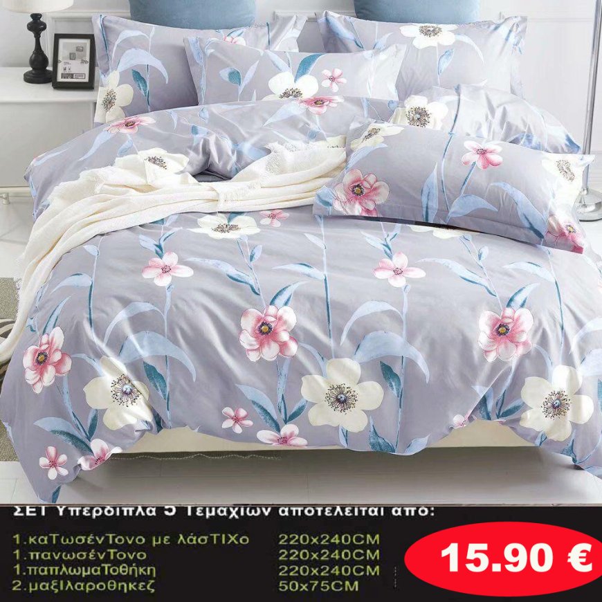Σετ κρεβατοκάμαρας υπέρδιπλα 5 τμχ. 1-παπλωματοθήκη 220Χ240-1 κατωσέντονο με λάστιχο 220Χ240-1 πανωσέντονο 220Χ240 και 2 μαξιλαροθήκες 50Χ75 σε διάφορα χρώματα