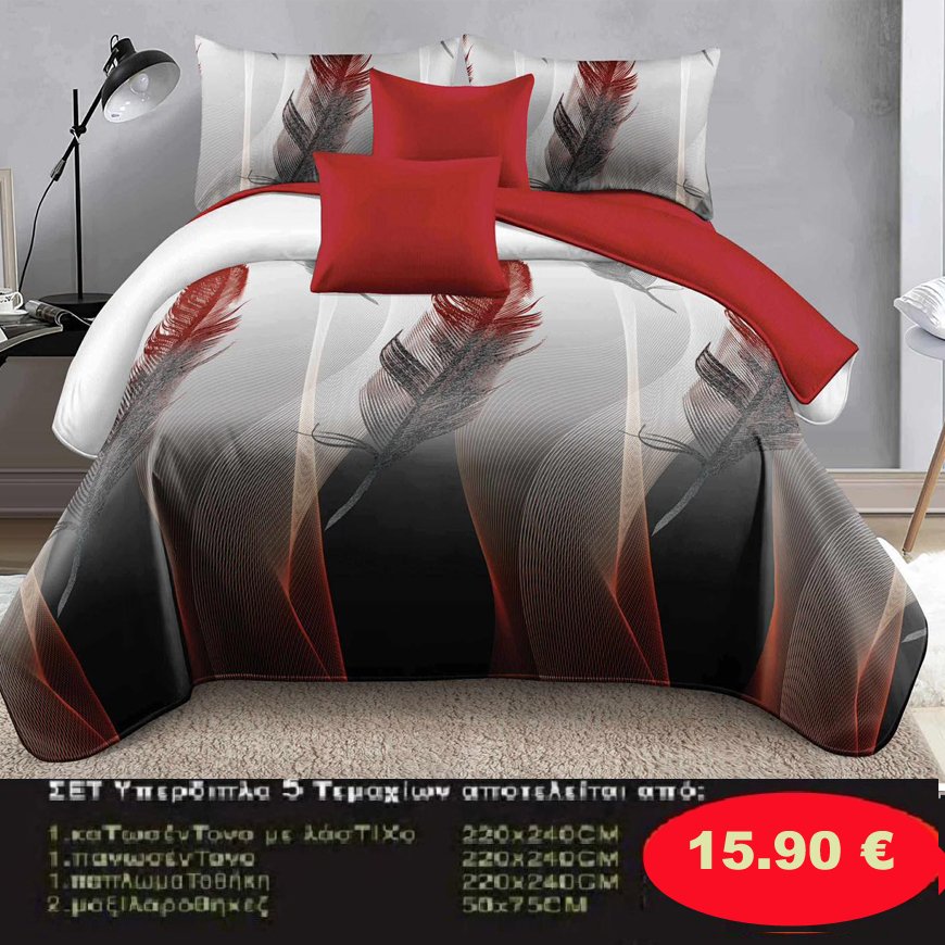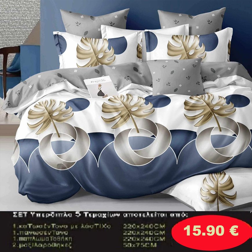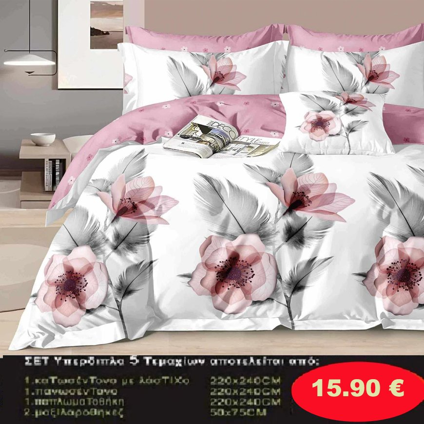 Σετ κρεβατοκάμαρας υπέρδιπλα 5 τμχ. 1-παπλωματοθήκη 220Χ240-1 κατωσέντονο με λάστιχο 220Χ240-1 πανωσέντονο 220Χ240 και 2 μαξιλαροθήκες 50Χ75 σε διάφορα χρώματα