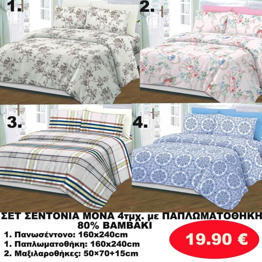 ΣΕΤ Σεντόνια ΜΟΝΑ 4 τμχ. 80 ΒΑΜΒΑΚΙ ΜΕ ΠΑΠΛΩΜΑΤΟΘΗΚΗ -1 παπλωματοθήκη-1 πανωσέντονο -και 2 μαξιλαροθήκες σε διάφορα χρώματα