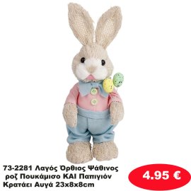 73-2281 Λαγός Όρθιος Ψάθινος ροζ Πουκάμισο ΚΑΙ Παπιγιόν Κρατάει Αυγά 23x8x8cm