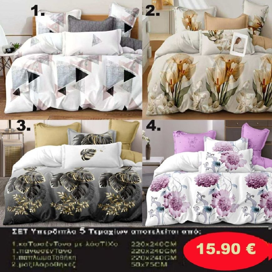 Σετ κρεβατοκάμαρας υπέρδιπλα 5 τμχ. 1-παπλωματοθήκη 220Χ240-1 κατωσέντονο με λάστιχο 220Χ240-1 πανωσέντονο 220Χ240 και 2 μαξιλαροθήκες 50Χ75 σε διάφορα χρώματα